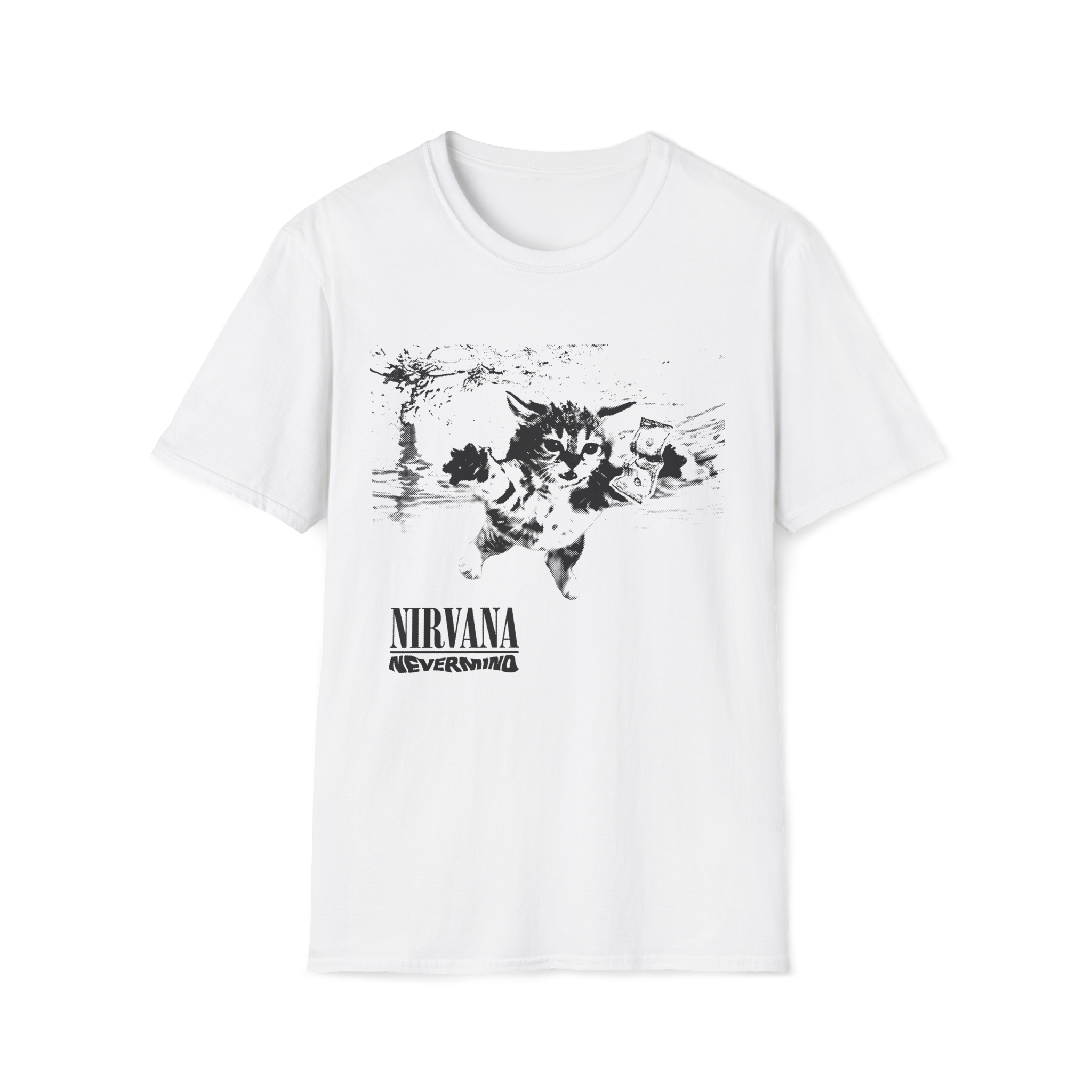 Parodia icónica de la portada del álbum «Nevermind» de Nirvana, sustituyendo al bebé por un gato nadando tras un billete. Un homenaje divertido y creativo para los amantes del rock de los 90.