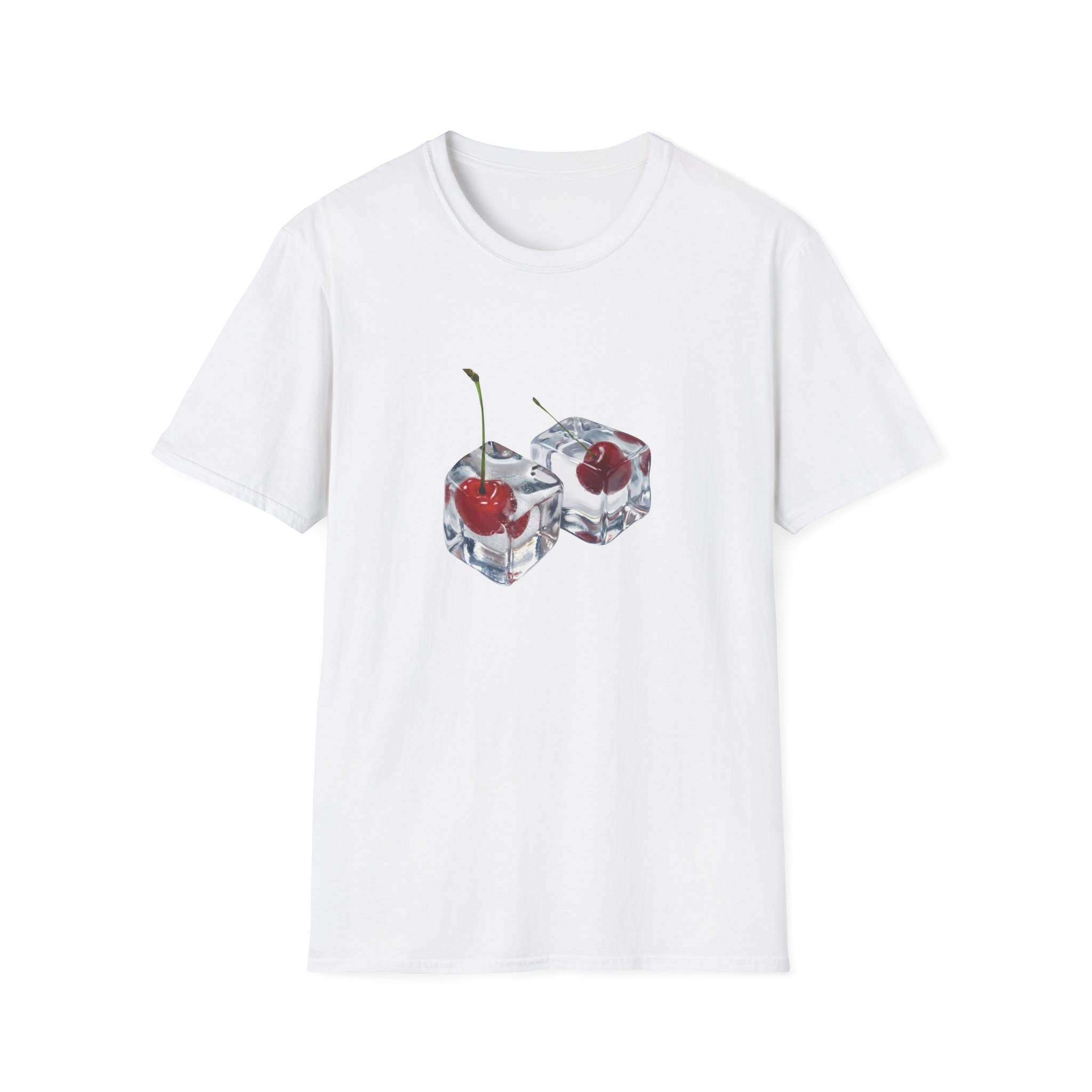 Camiseta con gráfico hiperrealista de cerezas en hielo. Un diseño fresco, moderno y visualmente impactante.