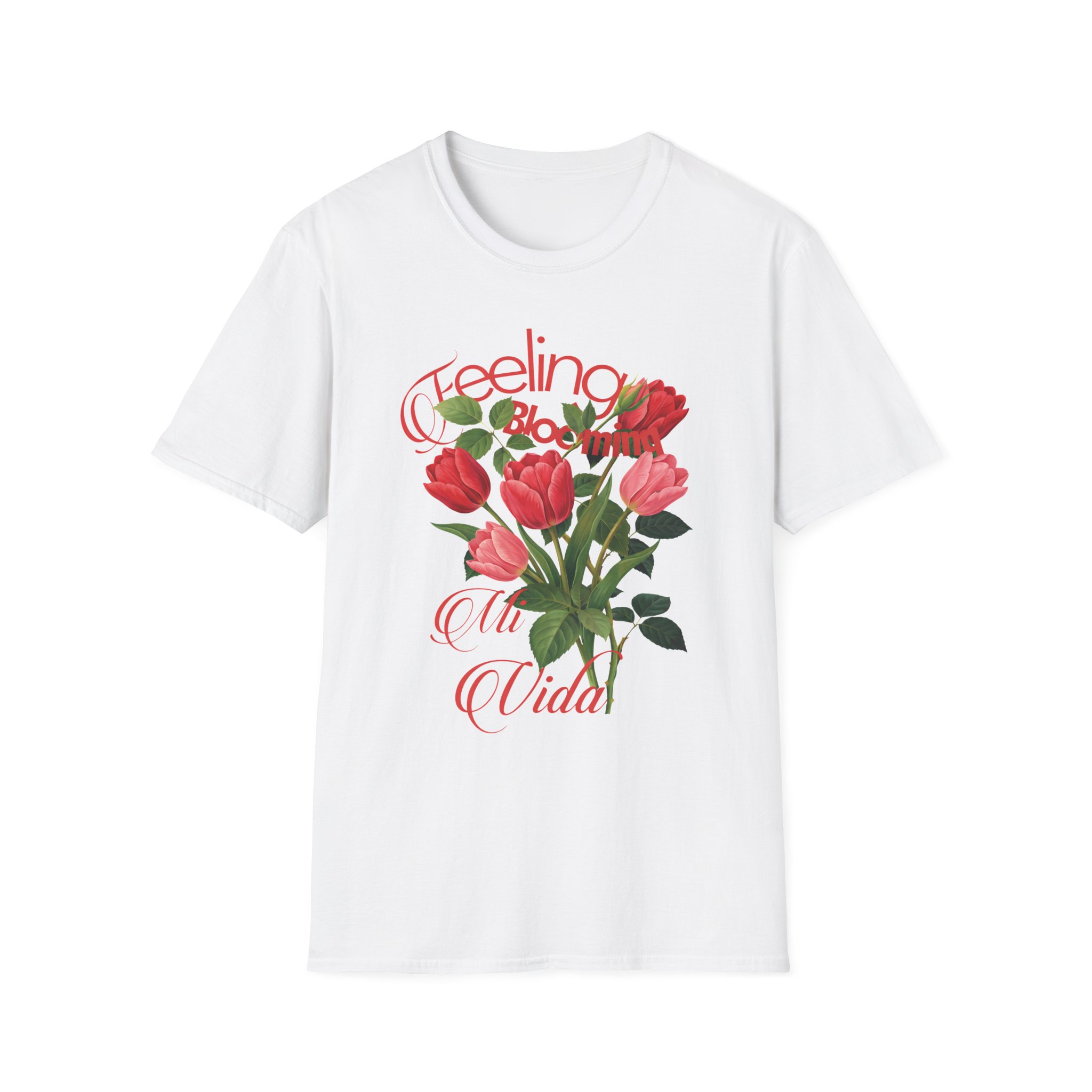 Celebra la vitalidad con este espectacular diseño de tulipanes rojos en plena floración. La combinación de tipografía cursiva clásica y el realismo de las flores crea una prenda romántica y llena de energía positiva.